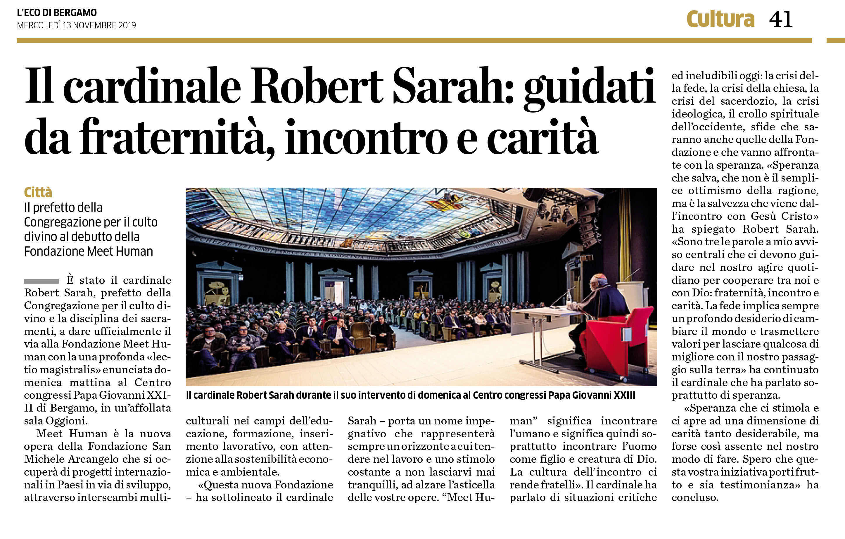 Bergamo, 11 novembre 2019 – È stato il cardinale Robert Sarah, prefetto della Congregazione per il culto divino e la disciplina dei sacramenti, a dare ufficialmente il via alla Fondazione Meet Human con la sua profonda lectio magistralis che ha enunciato domenica mattina al Centro Congressi Papa Giovanni XXIII di Bergamo, davanti ad una sala gremita.